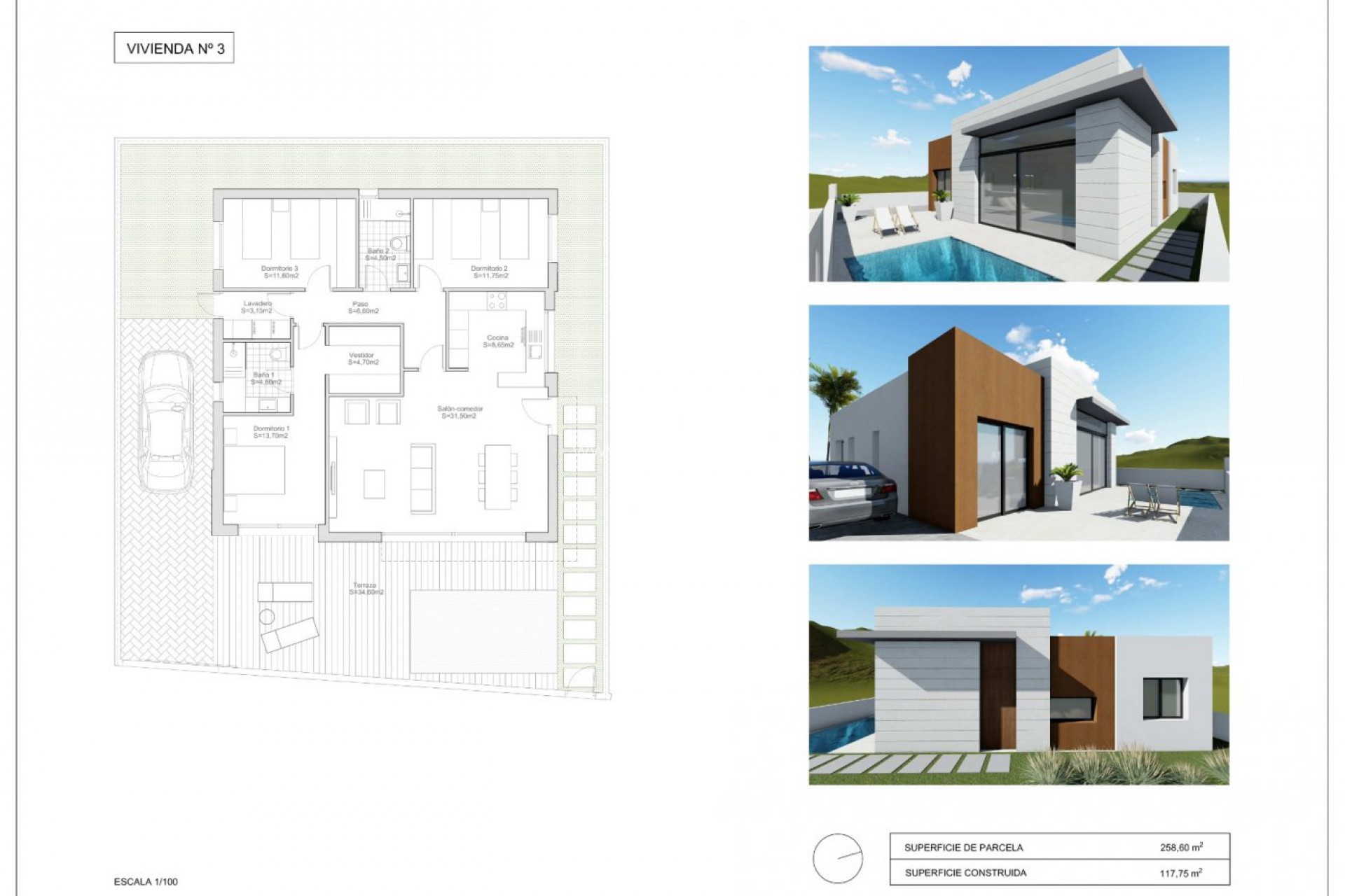 VILLAS DE OBRA NUEVA EN PILAR DE LA HORADADA Residencial de obra nueva de 6 chalets en Pilar de la Horadada. Las villas de nueva construcción de una sola planta tienen 3 dormitorios, 2 baños, cocina abierta con el salón, armarios empotrados, jardín privado con plaza de aparcamiento. Una opción para un solarium y una piscina privada a un costo adicional. Estas fantásticas casas están revestidas de piedra natural para un mantenimiento mínimo, la doble altura del salón y los grandes ventanales proporcionan mucha luz natural. Pilar de la Horadada es la ciudad y el municipio más meridional de la Costa Blanca en la provincia de Alicante. La ciudad se encuentra en la frontera entre la Comunidad Valenciana y la región de Murcia. La ciudad de Pilar de la Horadada es un típico pueblo español situado a sólo 2 km de la costa y de las populares playas de Torre de la Horadada. En el centro de Pilar de la Horadada encontrará todos los servicios: tiendas, pastelerías, bancos, etc. a lo largo de la calle principal 'Calle Mayor'. También experimentará un maravilloso ambiente cerca de la iglesia local en la 'Plaza de la Iglesia' donde hay varios cafés. En Pilar de la Horadada también hay una red de senderos para ciclistas y caminantes bien desarrollada, y también hay una gran oferta de diversas actividades deportivas. El campo de golf Lo Romero de 18 hoyos está a poca distancia del pueblo. Los aeropuertos de Corvera (Murcia) y Alicante están a 40 y 55 minutos respectivamente.