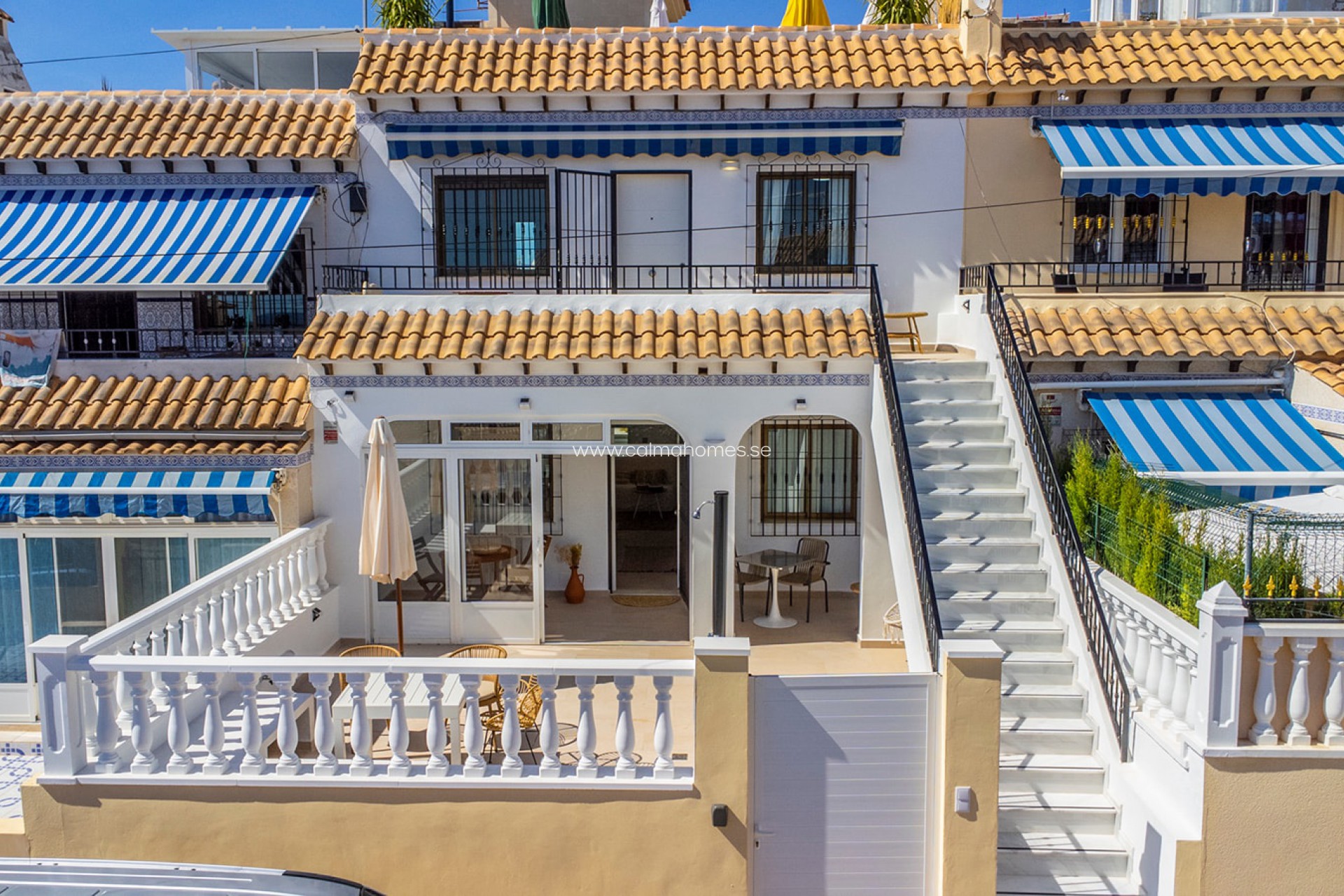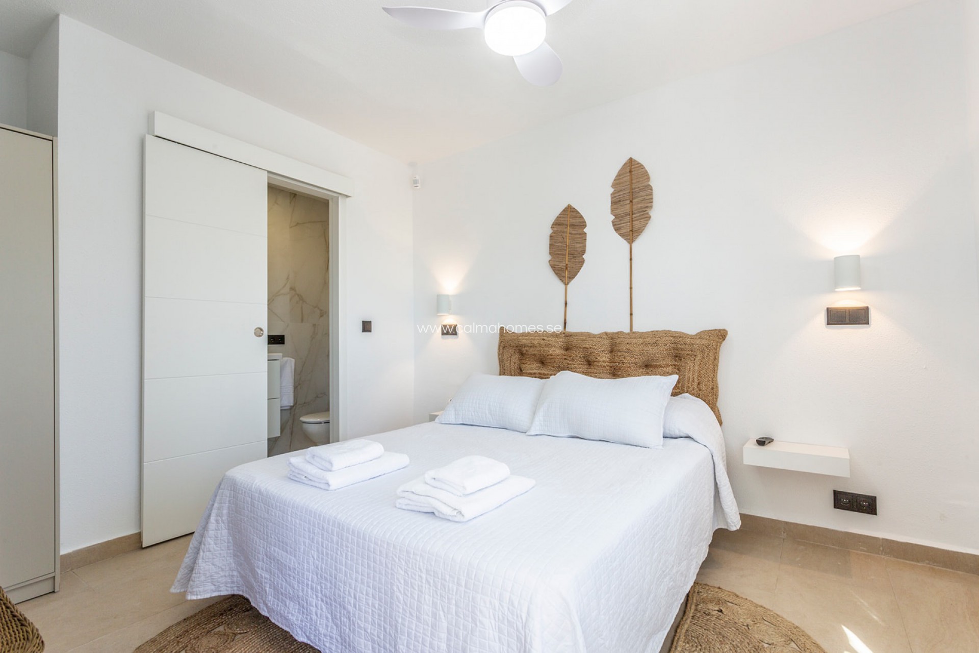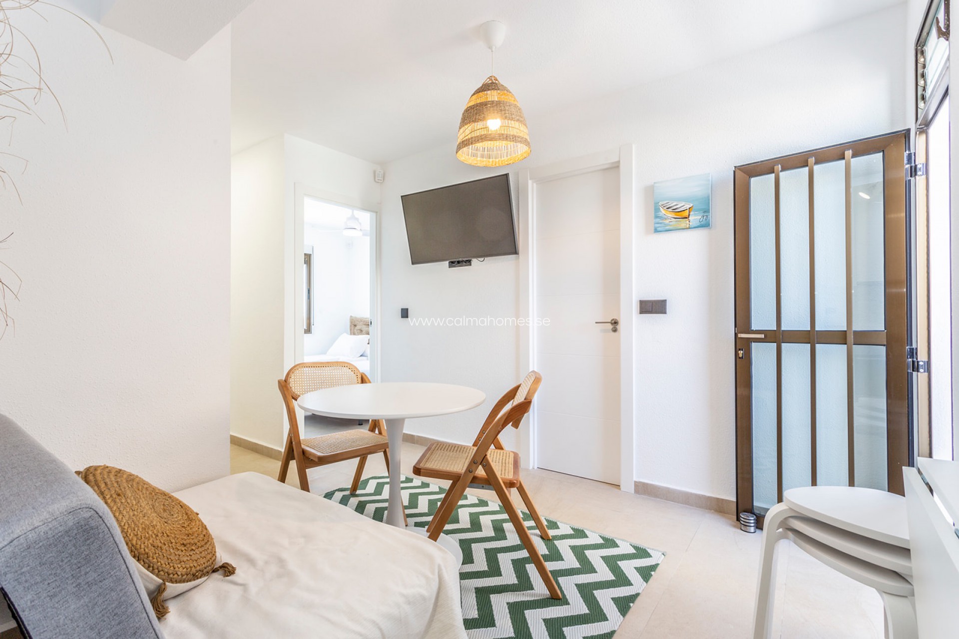 The white facade illuminates the area and after climbing the stairs you stand on the balcony where you can enjoy the sun and the nice view of the urbanization and the sea. The bright white theme also continues into the home where there are two bedrooms, two bathrooms and an open plan kitchen with the living room. From the living room there is a door that leads you out to the stairs that go directly up to the absolutely incredible roof terrace. The roof terrace is 40m2 and, like the rest of the apartment, it is also fully furnished and up here there is also an outdoor kitchen in the form of a built-in grill and also running water. Up on the roof terrace you can enjoy the sun all day and if you get a little hot there is a shower to cool off in.