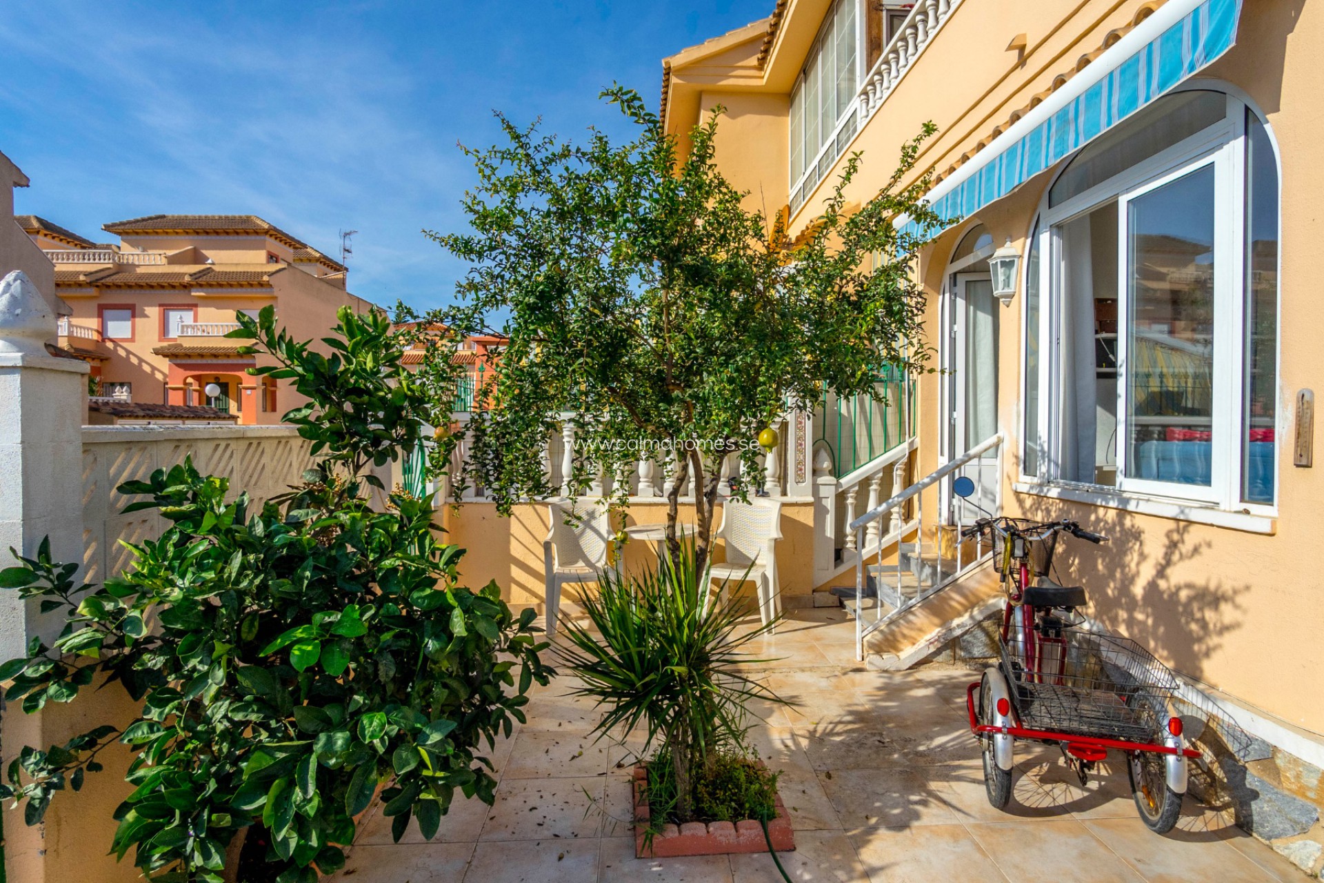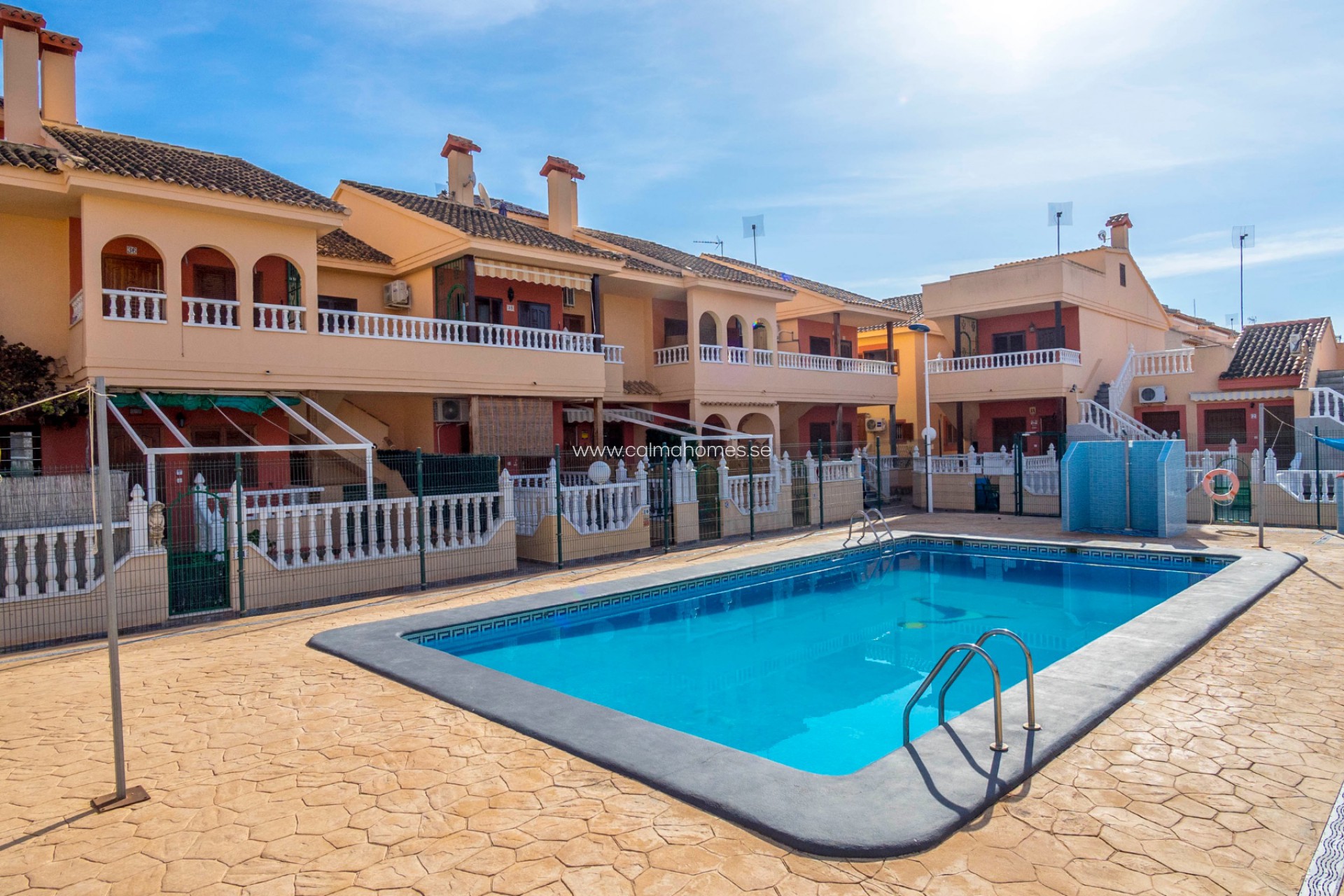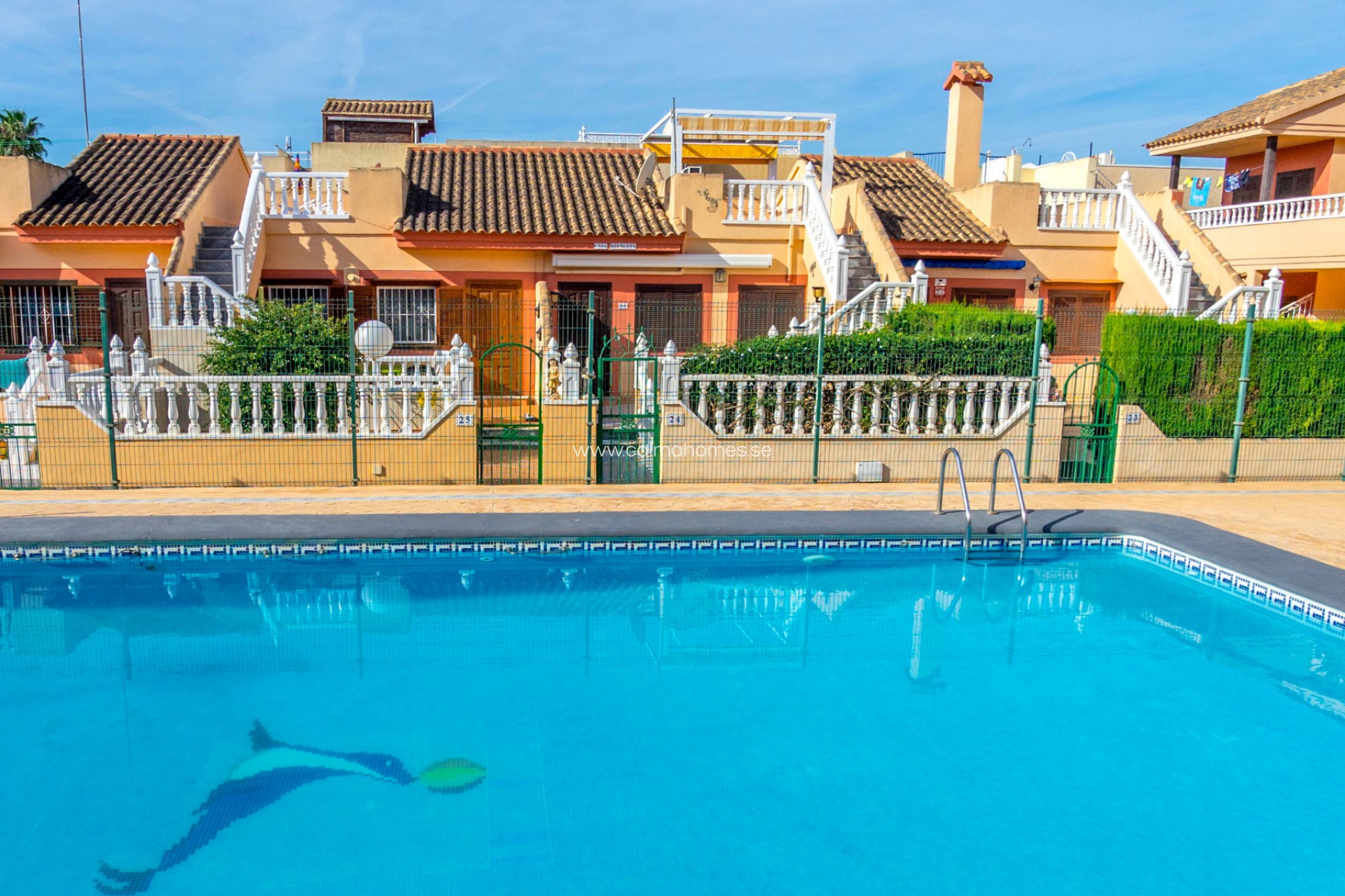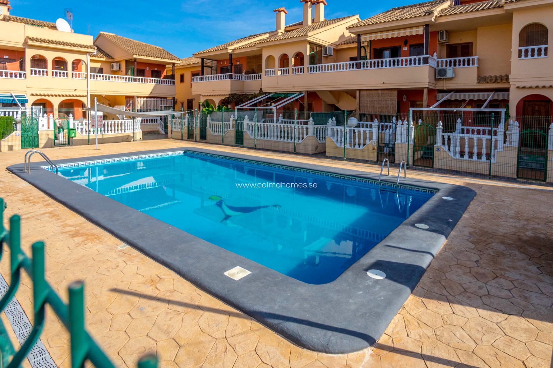 This studio is on the ground floor in a quiet and beautiful gated community. The studio is south-facing and you can enjoy the sun all day outside in the large garden, thanks to the large windows the sun's rays also shine into the entire apartment. To enter the apartment, there are 2 steps up to the front door which lead to the living room/bedroom and open plan kitchen, the bathroom is located further inside and there is also a shower.