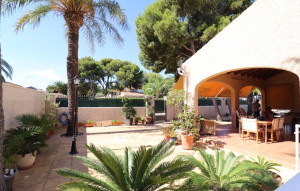 Lovely detached mediterranean style villa with south orientation, 555 m2 plot, house in one floor 220 m2 built. The property has 4 bedrooms, 2 bathrooms, 1 toilet, living-dining room with fireplace, big independent kitchen with closed gallery, garage, swimming pool 8 x 4 and big porch. Sold furnished with air conditioning. Only 400 mts from the beach in Punta Prima.